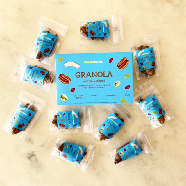 Granola proteica: sem adição de açúcar, tem um leve sabor de coco, finalizada com toque suave de canela e de cardamomo. Completam esse cenário degustativo castanha de caju, amêndoa, semente de girassol e de abóbora e flor de sal. Pode ser encontrada na loja virtual da Made Real por R$ 49,90.