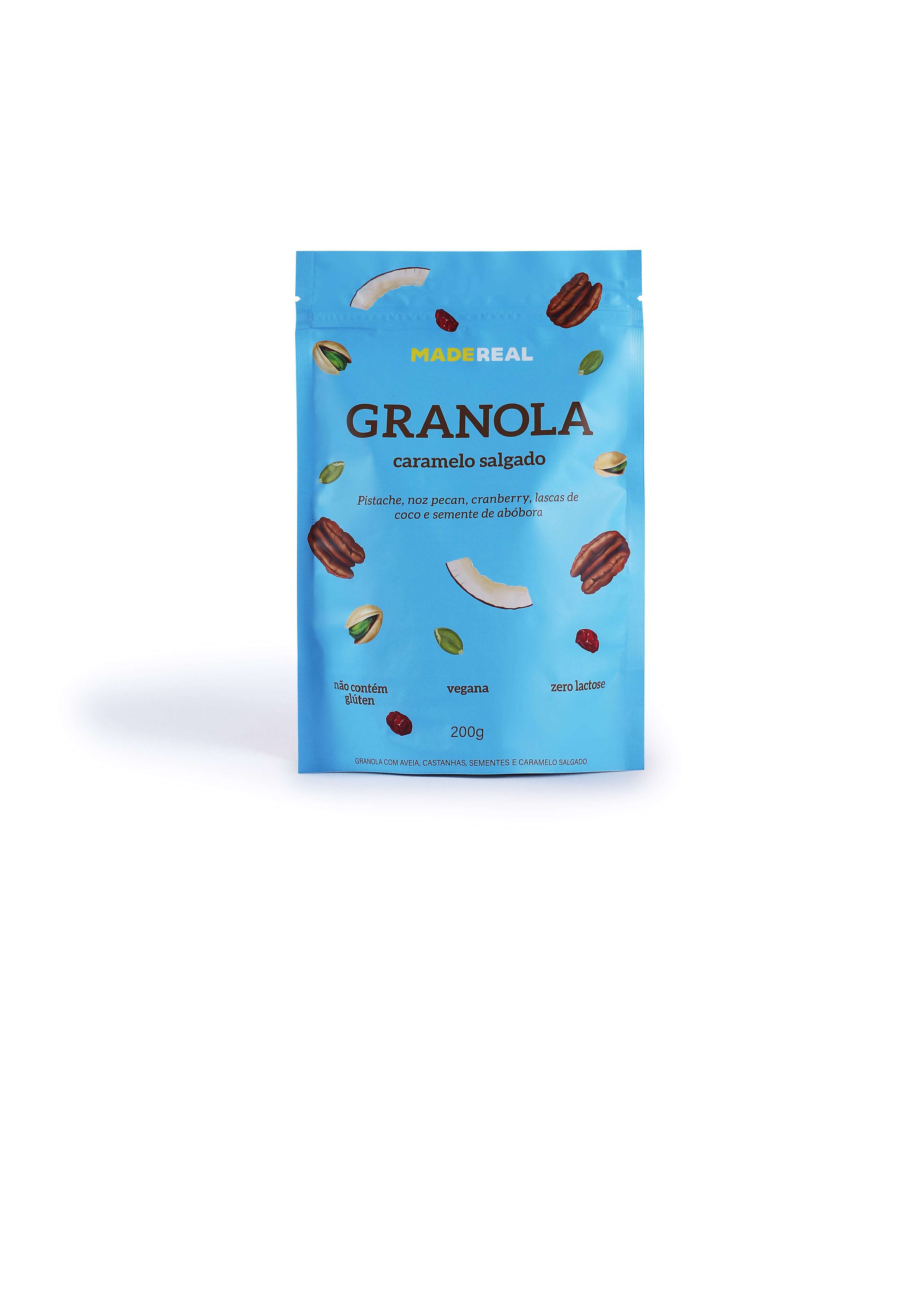 Granola vegana de caramelo salgado: perfeita para ser saboreada com fruta ou até mesmo na salada e o melhor: sem perder a crocância. Rica em fibras e com baixos índices de gordura, pode ser incluída em dietas mais restritivas e é composta por pistache, noz pecan, cranberry, lascas de coco e semente de abóbora. Pode ser encontrada na loja virtual da Made Real por R$ 39,60.
